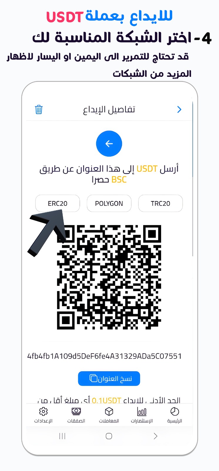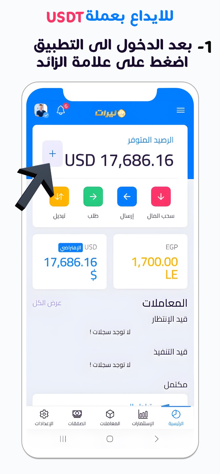 - ننقر على اشارة + حتى يتم الايداع ونختار usdt مرتين
