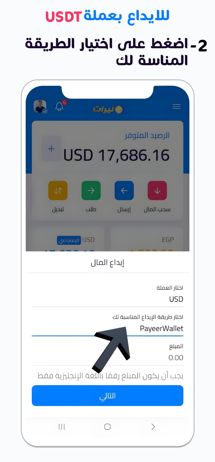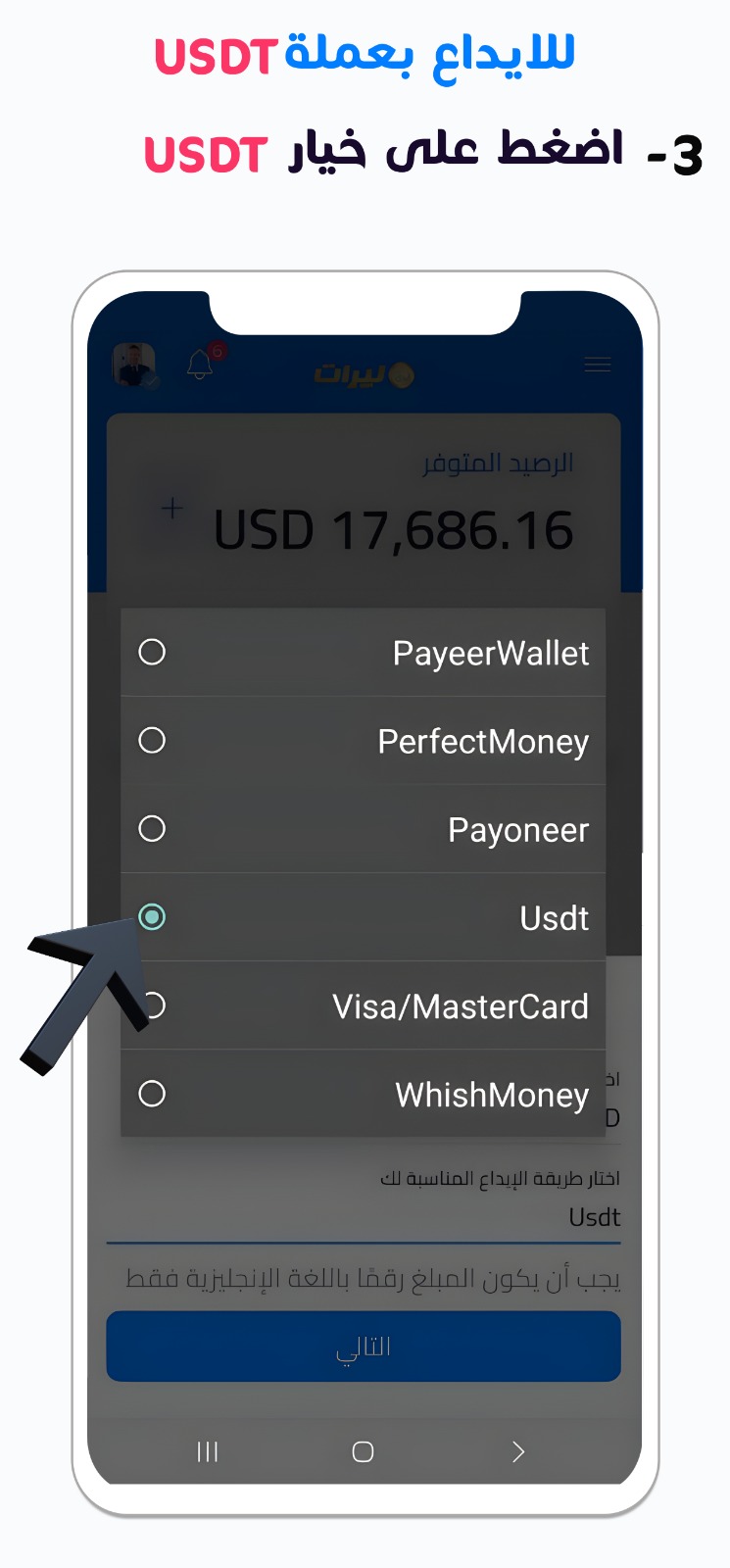 - نضغط على علامة + لإنهاء الإيداع، ثم نضغط نقرًا مزدوجًا على USDT لتحديد المبلغ الذي نرغب في إيداعه.